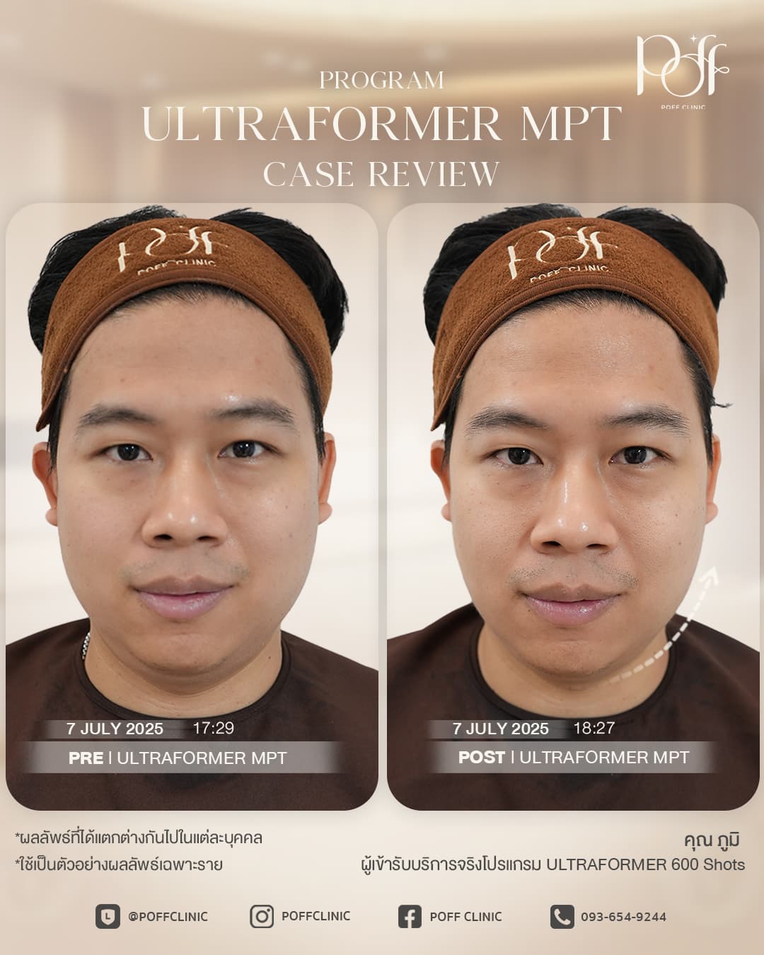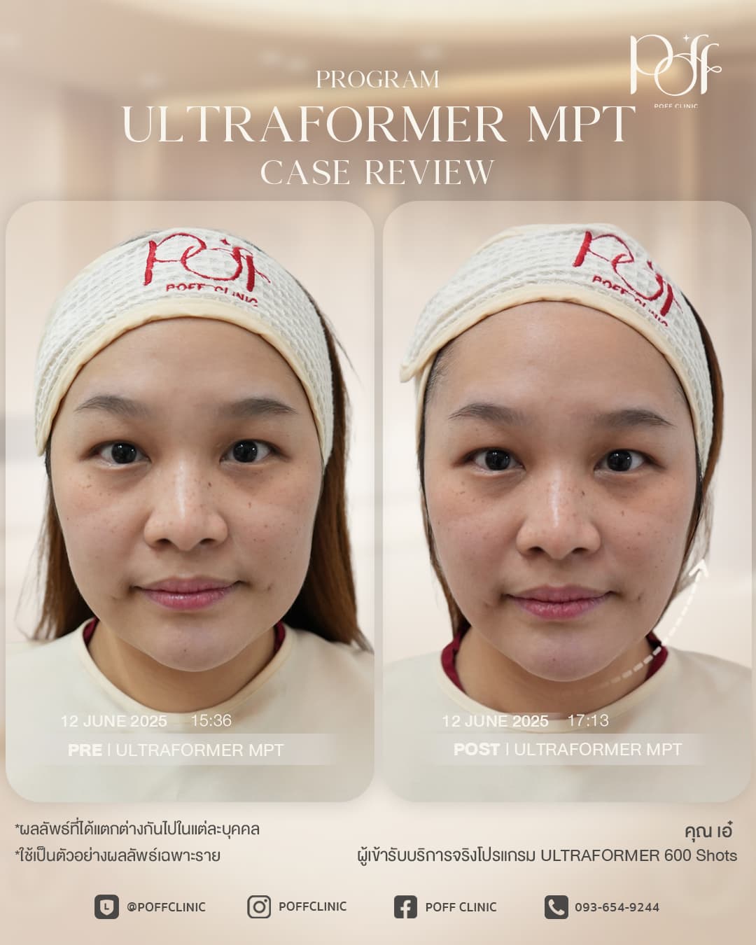 Ultraformer MPT คือเทคโนโลยี HIFU (High-Intensity Focused Ultrasound) ที่ยิงพลังงานลงจุดเล็ก ๆ ได้หลายระดับความลึก ทั้งชั้นหนังแท้และชั้นพังผืด SMAS เพื่อยกกระชับ เก็บกรอบหน้า ลดความหย่อนคล้อย และกระตุ้นการสร้างคอลลาเจนใหม่
